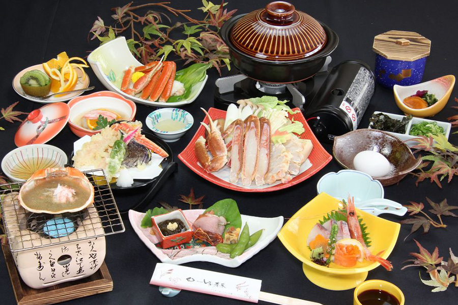 山陰地方の冬の味覚、蟹!大きな土鍋を囲んで蟹鍋を堪能できる蟹鍋コースと、自分のペースでお鍋を楽しめる一人鍋の蟹会席。日本海で捕れたお刺身や、蒸し物もついています。